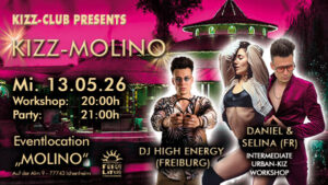 Dj auf dem Kizomba-Dancefloor ist DJ High Energy aus Freiburg (Kizomba-Taraxxa) und von 20-21 Uhr gibt es einen Kizomba-Intermediate Workshop mit Daniel (FR) & Selina (FR).