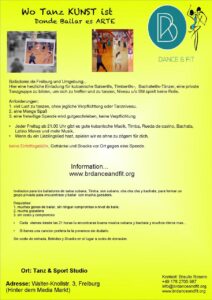 Ab sofort bietet Braulio Rosero jeden Freitag ab 21 Uhr im Salsastudio (Inhaber: Flavio Alborino) offene Kuba-Tanz-Treffs für alle Klassen an. Wer Lust hat, dazuzukommen und mitzumachen, ist herzlich eingeladen. Der Eintritt ist frei – um Spenden wird gebeten, ebenso für Getränke und Snacks.
