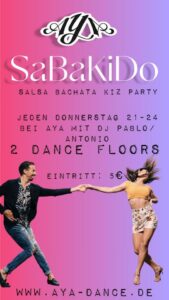 Die Freiburger Tanzschule AYA-Dance veranstaltet jeden Donnerstag von 21 bis 24 Uhr eine SaBaKiDo-Party – was so viel heißt wie: Salsa, Bachata, Kizomba am Donnerstag.