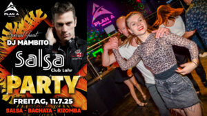 Salsa, Bachata & Kizomba Night am Freitag 11. Juli (und nach der Sommerpause dann wieder am 12.09.) 2025 in Lahr in der Discothek Plan A in Kooperation mit dem Salsa Club Lahr. Am 11. Juli mit Special-Guest-DJ Mambito aus Freiburg – die ganze Nacht die schönsten Latino Beats. Tauche ein in eine heiße Tanznacht in einer wunderschönen Location.