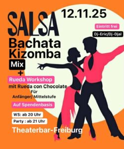 November 12, 2025 20:00 (ICAL) SaBaKi + Rueda Date: November 12, 2025 20:00 (ICAL) Location: Theaterbar (ehemals Jackson Pollock Bar) Bertoldstraße 46 Freiburg (D) Details: SaBaKi-Mix und Rueda-Workshop in der Theaterbar Freiburg.