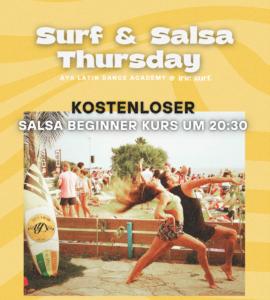Ab Do, 30. April 2026 geht e wieder los mit dem Surf and Salsa Thursday – eine Kooperation der AyA Dance Academy Freiburg mit dem Irie Surf Club!